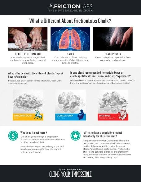 Gorilla Grip is quality chalk that has both magic dust and some chunks. Designed to help you consistently climb at your limit, FrictionLabs chalk is made for climbers, by climbers.This is not the same old white-labeled generic chalk climbers are used to.